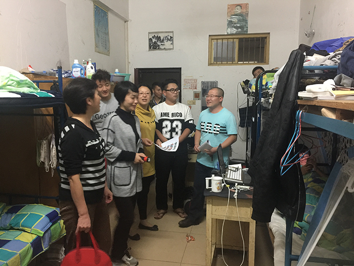 为了促进学生宿舍安全建设,全面深入地了解学生住宿情况。2016年10月20日晚上11点和10月27日早上5点,304永利集团官网入口党总支副书记张曙带领全体辅导员老师深入学生宿舍看望学生,并着重排查私自外出走读的学生。