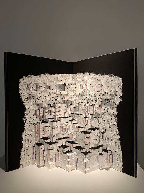 本次展览受邀艺术家包括蔡国强、邱志杰、陈琦、施慧等国内外知名艺术家,作为本次展览最年轻的受邀艺术家,唐征维老师的参展作品是他最新创作的系列作品《碳折叠 NO.3》和《子夜系列》。《碳折叠 NO.3》是碳折叠系列作品的第三件,主要通过纸艺术的形式阐述对西方碳金融背后的权力架构的思考,作品尝试将排放的主要基础——工业体组合成一个“排放帝国”,在手法上融合剪纸与立体折纸,最后形成书籍的样式,这个“排放帝国”在书的开合中形成存在与超越。《子夜系列》作品均是在特定的时间——子夜完成的构思,设计构思在意识显像的那一刻形成并被记录下来,然后通过剪纸的形式再创作出来。近年来,唐征维老师凭借独特的作品语言和深邃的思想深度在纸艺术领域崭露头角,多次参加国内重要展览,作品被中国美术学院、金杜艺术中心等机构收藏。