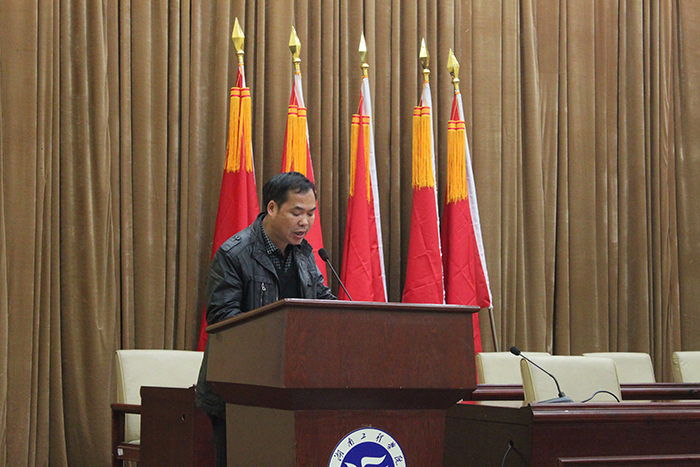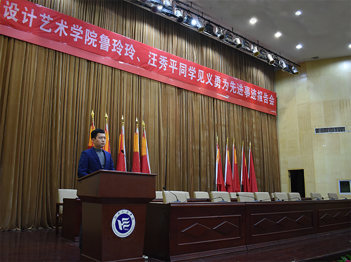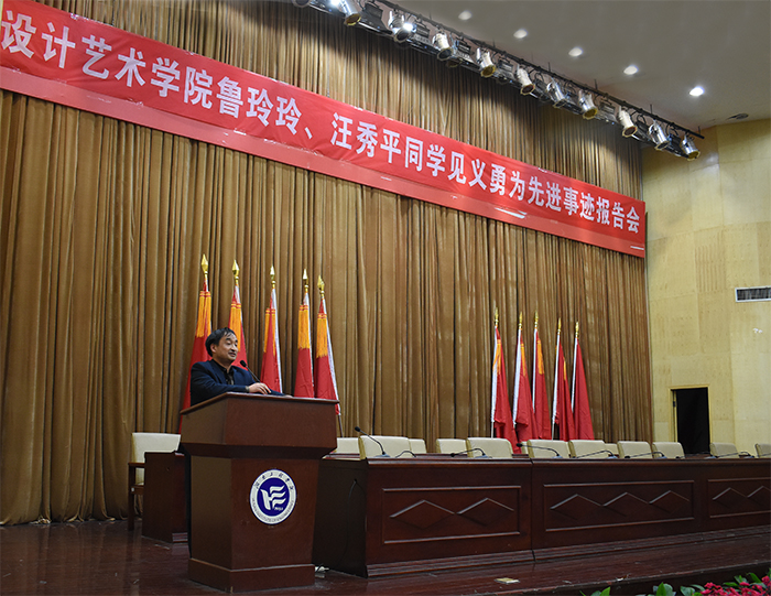 会议开始,主持人张澎向大家讲述了11月2日下午在永利集团官网体育馆师生三人救助男青年的见义勇为先进事迹。永利集团官网环境设计专业1604班汪秀平、鲁玲玲同学20分钟的紧急救援挽救了一个年轻的生命,在救助过程中承受了巨大压力,事后却未曾向任何人提及救人事件,直到14日被救的青年与其家人、领导来校向师生三人赠送锦旗,见义勇为先进事迹才浮出水面。