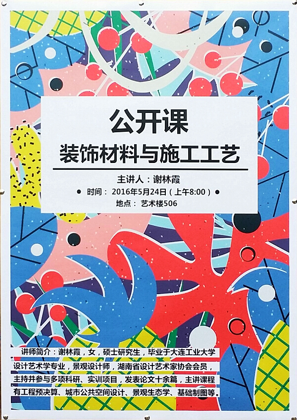 为了进一步加强教研室建设,促进教师间的教学交流,环境设计教研室谢林霞老师将于2016年5月24上午第一节课在艺术楼506教室讲授《装饰材料与施工工艺》公开课,希望全院师生届时参加,特此通知!
