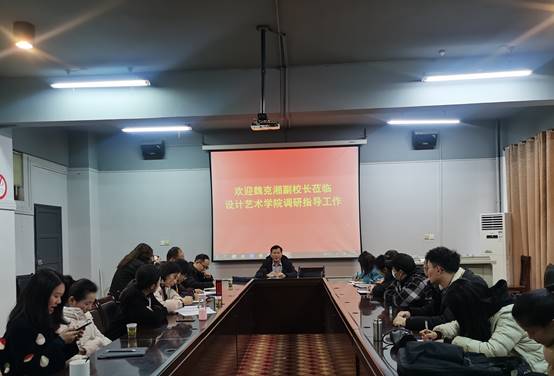 魏克湘还与学院老师开展座谈,耐心听取学术骨干、青年教师代表对学校科技管理和学科建设相关政策的意见和建议,并一一回应大家的关切。魏克湘副校长还就设计学科如何与学校优势学科做好交叉融合展,培育高水平成果等方面提出建设性指导意见。