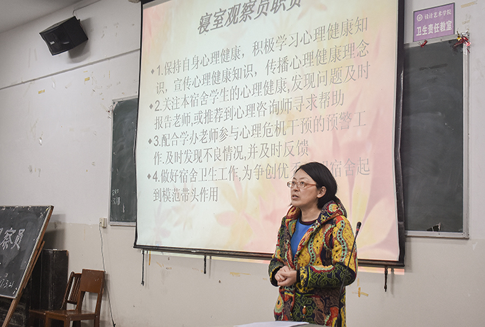 会议中,304永利集团官网入口学办主任晏莉强调大学生的心理健康一直是学校关注的重要问题。为了更好的让各个寝室联络员进行工作,院里拟定了“寝室联络员职责”,要求各位寝室观察员应该以身作则,保持自身心理健康,积极学习心理健康知识,宣传心理健康知识,传播心理健康理念;积极关注本宿舍学生的心理健康,发现问题及时报告老师,或推荐其寻求心理咨询师的帮助;配合学办老师参与心理危机干预的预警工作。