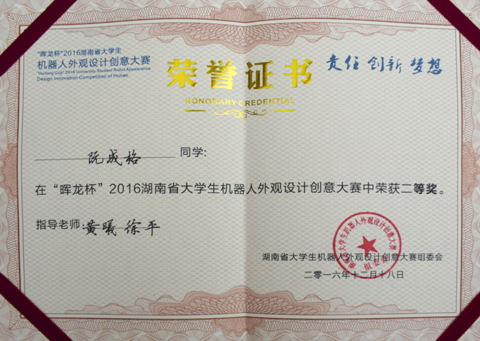 创新推动发展,科技引领未来。12月18日,“晖龙杯”2016湖南省大学生机器人外观设计创意大赛在湖南大学隆重举行。此次大赛由湖南省发明协会、湖南省机器人产业协会共同主办,由湖南晖龙集团股份有限公司承办,并得到了湖南省知识产权局、国家知识产权局专利局长沙代办处的大力支持。“晖龙杯”湖南省首届大学生机器人外观设计创意大赛自九月底开始启动,大赛共收到了来自全省近30所高校的388名大学生的219件作品,省、市领导,专家学者、企业代表等近400人出席了本次大赛。永利集团官网304永利集团官网入口产品1302班阮成格同学荣获创意大赛二等奖。