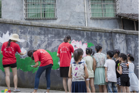 寓教于乐,用“新”支教留守儿童。父母常年在外打工,暑假到处游窜成了当地孩子们的“家常便饭”。本次下乡团队的支教组将孩子们汇集到一起,创新教授模式,手把手辅导留守儿童功课。此外,他们还结合自身优势,将绘画带到了课堂,同时以当地“荷花”为主题,利用墙绘给孩子们上了一堂生动的室外实践课程,既传播了知识,又保障了孩子们的安全。