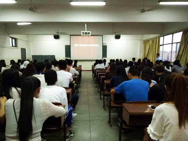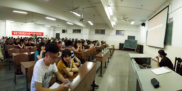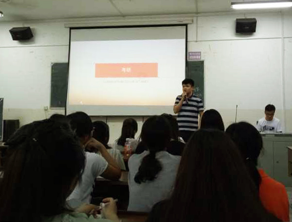 一开场,个性的自我介绍就让同学们对他们留下了很深的印象。接着周婷婷就为什么要考研以及如何考研等问题做了详细讲解,并推荐了几个学习网站及软件,让同学们能够更全面、更广泛的掌握考研的相关知识。曾嘉针对如何考研的问题,分别从专业、英语、政治三方面分析。条理清晰,为同学们扫清了不少考研方面的迷惑。杨婕则以切身经历向同学们讲述了考研的宝贵经验。她风趣幽默又蕴含哲理的发言赢得了同学们阵阵热烈的掌声。最后,赵瑞分析了面试中的相关技巧,让同学们对这一方面的知识有了进一步的了解。