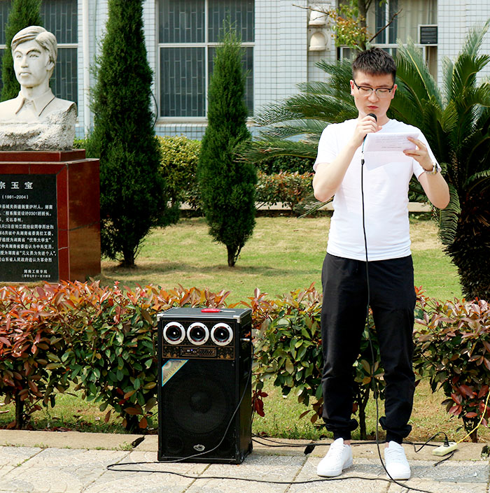 辅导员张超在此次活动进行了简短且深刻的讲话,简短的介绍了宗玉宝同志的身平,高度赞美了他的英勇事迹,同时他还号召全院学生向宗玉宝同志学习,学习他的这种精神,为建设校园,尽一份力,为社会这个大家庭尽一份力!