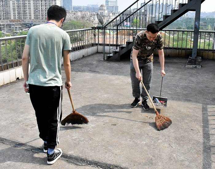 活动中,老师和学生划分了多个卫生责任区域,制定了详细的任务分工。大家拿起扫帚、拖把、抹布等劳动工具,对教学楼展开了大扫除。在大扫除的过程中,个个热情高涨,干劲十足,半天功夫就对办公区域、教室的卫生死角和户外绿化带上的白色垃圾、枯枝杂草等进行了全面清扫,做到不留一片垃圾、不见一个烟头。他们在劳动中脸上透露出的欢乐笑容,显示着他们饱满的热情和积极的状态。