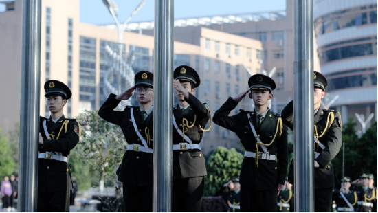 迎着初升的太阳,踢着整齐的正步,国旗护卫队的旗手们护卫着鲜艳的五星红旗入场。伴随着《中华人民共和国国歌》的响起,在全体师生的注目礼下,五星红旗在晨曦中迎风飘扬。