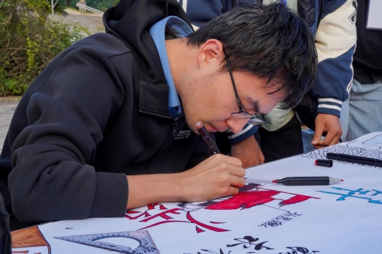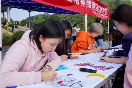 活动现场,学子们策划、起笔、勾线、填色,他们聚精会神地用笔触勾勒着轮廓线条。自动化2301班的谢同学在画鲁班锁,她说道:“我觉得鲁班锁的精巧和缜密,展现了执着专注、精益求精的工匠精神。”我院的学生集思广益,他们认为湖湘文化与湖湘传统技艺共同孕育的湖湘工匠精神有非常鲜明的特点,因此他们手拿画笔,专注地在画纸上挥毫泼墨,经过近3个小时的努力,“湘匠”二字跃然纸上,生动再现了当时匠人们专注于手工技艺的场景。还有同学在卷中写字,挥毫写下了“工匠精神”四个大字。活动现场还展览了学生已有的工匠作品,吸引了很多人的驻足。现场还邀请观看的同学一起参与,共绘画卷,一个个灵动的图案在画卷上涌现,一幅幅精彩的作品呈现在画卷上。