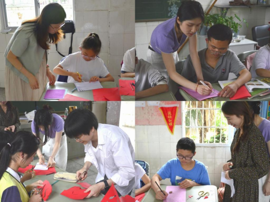 “同学们,剪纸艺术是我国民间美术中一门独特的艺术表现形式,是享誉世界的文化遗产,……”随着学院唐征维老师绘声绘色的引导以及特教老师的手语翻译,剪纸艺术之旅正式开始。唐老师耐心地向聋哑学生们传授剪纸的基本技巧,引导他们练习一些简单的剪纸元素。同学们聚精会神地观看、模仿,他们的双手在彩纸上穿梭,不一会儿,各种形状的剪纸作品便逐渐成形。在剪纸过程中,唐征维老师耐心指导并鼓励学生们积极发挥想象、合理进行创作。随后,唐老师带领大家挑战了一个颇具难度的剪纸作品——双龙戏珠。这个作品不仅考验学生们的剪纸技巧,更要求他们发挥想象力和创造力。魏丹老师和志愿者们则在旁边辅助教学,及时解答学生们的问题,提供必要帮助。
