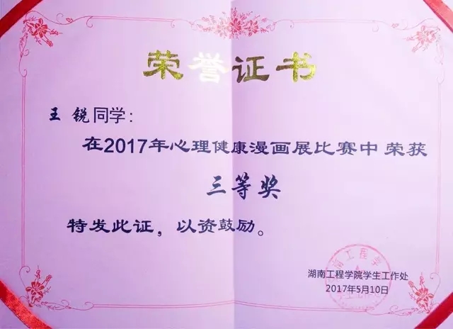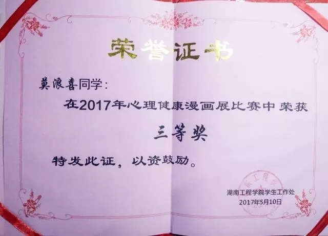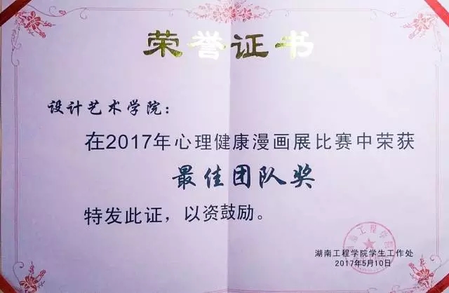 永利集团官网一直重视学生的心理健康,不断创新永利集团官网学生心理健康教育的形式和方法,本次大赛为学生提供了一个展示自我的平台,各班都拿出了许多优秀的参赛作品。永利集团官网数件漫画作品在大赛中脱颖而出!获得了学院最佳团队奖与三个个人奖,分别是环境设计1603班厉程获得个人二等奖、环境设计1603班王锐获得个人三等奖、产品设计1601班莫浪喜个人三等奖!