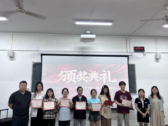 随后,颁奖环节。缪智文与文梦雪共同为2023-2024年度十佳心理委员颁奖,环境设计2102班的韩鹭等十位同学荣获此殊荣。他们凭借在心理委员工作中的出色表现,赢得了师生们的广泛认可。