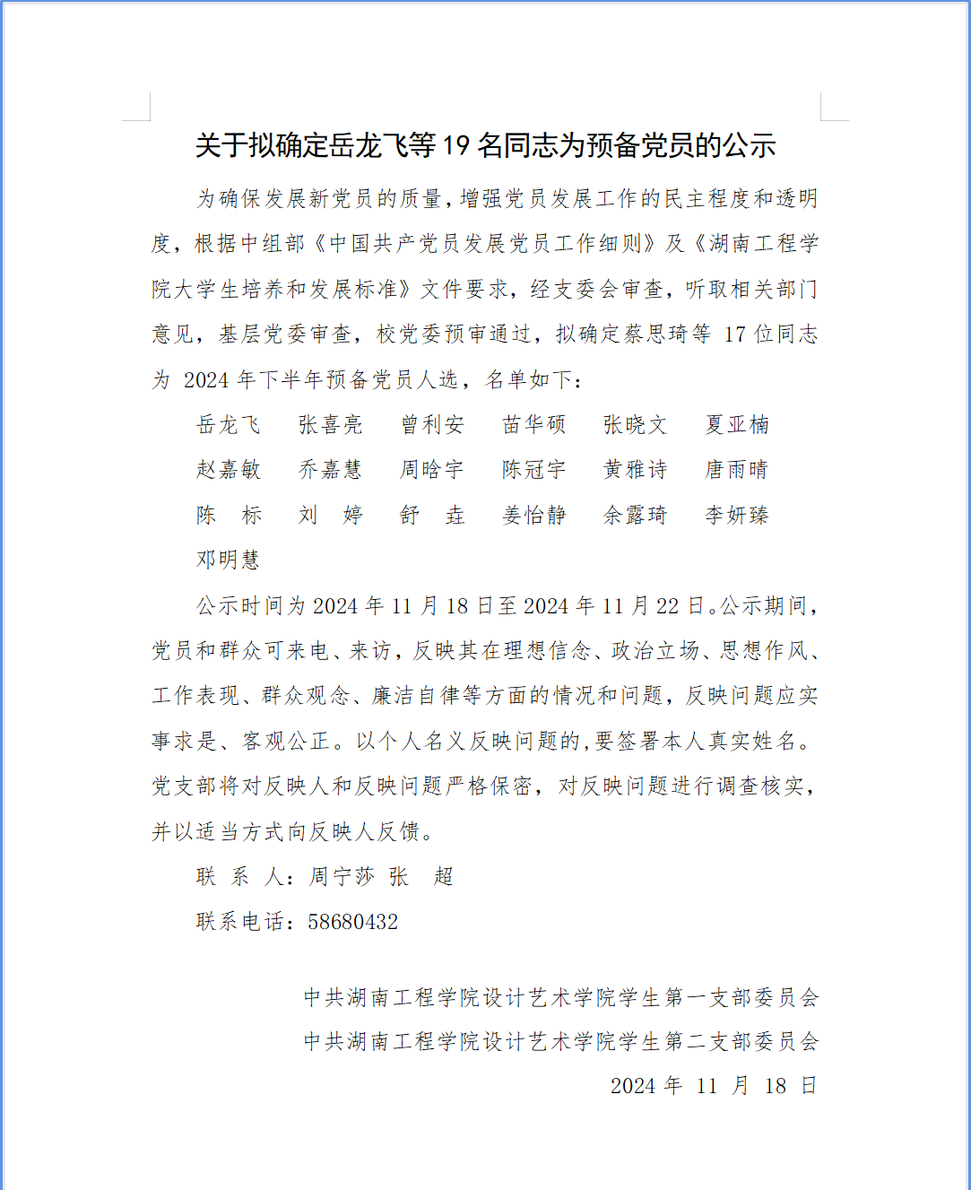 关于拟确定岳龙飞等19名同志为预备党员的公示